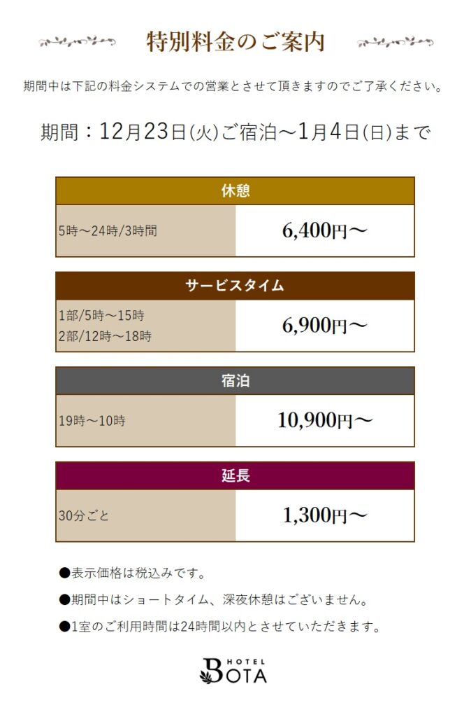 年末年始料金のお知らせ